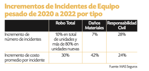 MAS Seguros, bróker de seguros especializado en equipo pesado más grande del país, ha identificado que esta tendencia alcista se observa tanto en robo total, daños materiales y responsabilidad civil, en momentos en que justa- mente las carreteras del país se han vuelto más peligrosas para el transporte de mercancías, a la par de una incesante racha ascendente en la inflación, que incide, por ejemplo, en la reposición de piezas para reparación de las unidades.